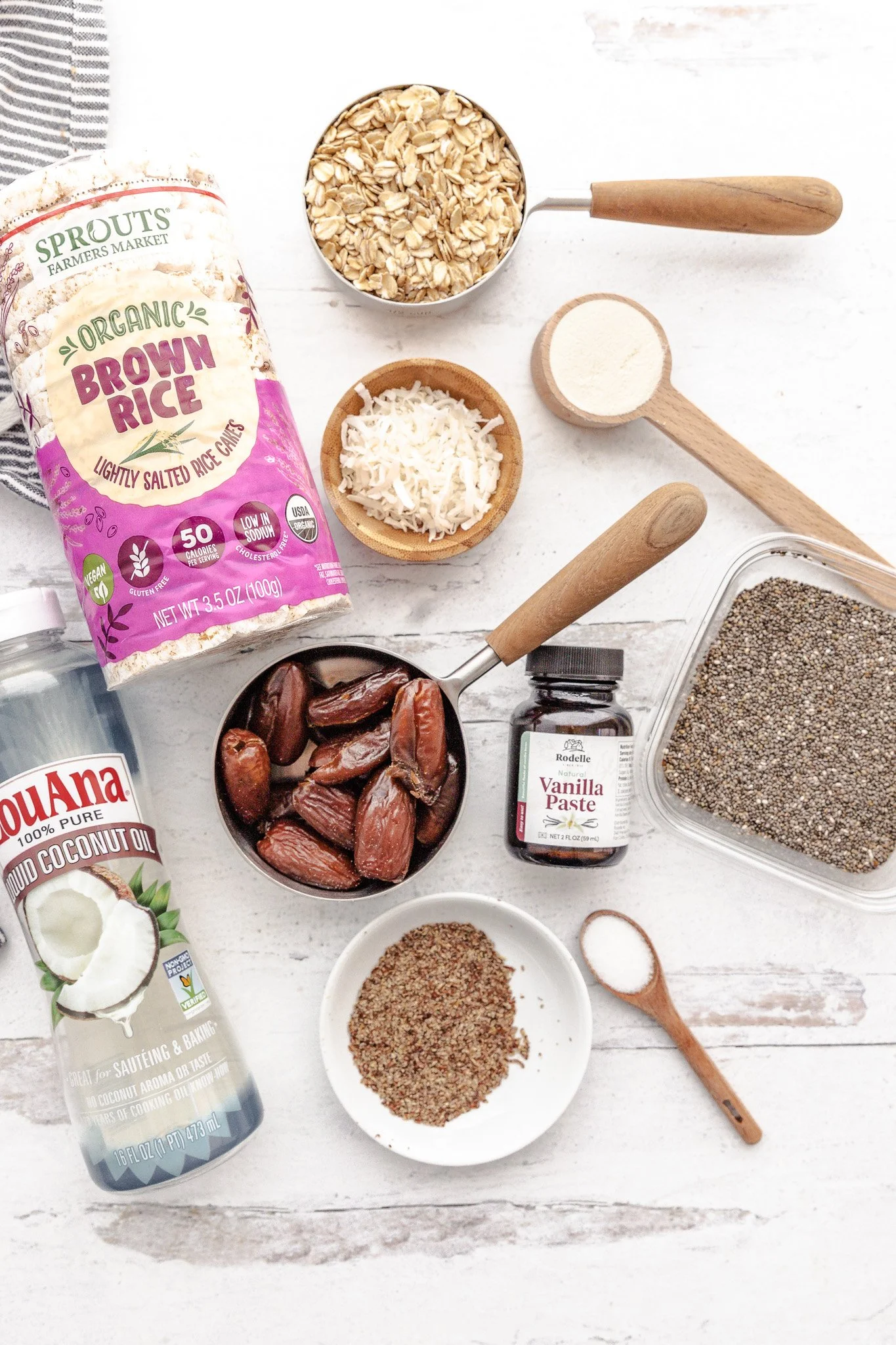 Blend dry ingredients: In a food processor, pulse oats, coconut, hemp seeds, flax, rice cakes, protein powder, and salt until combined.