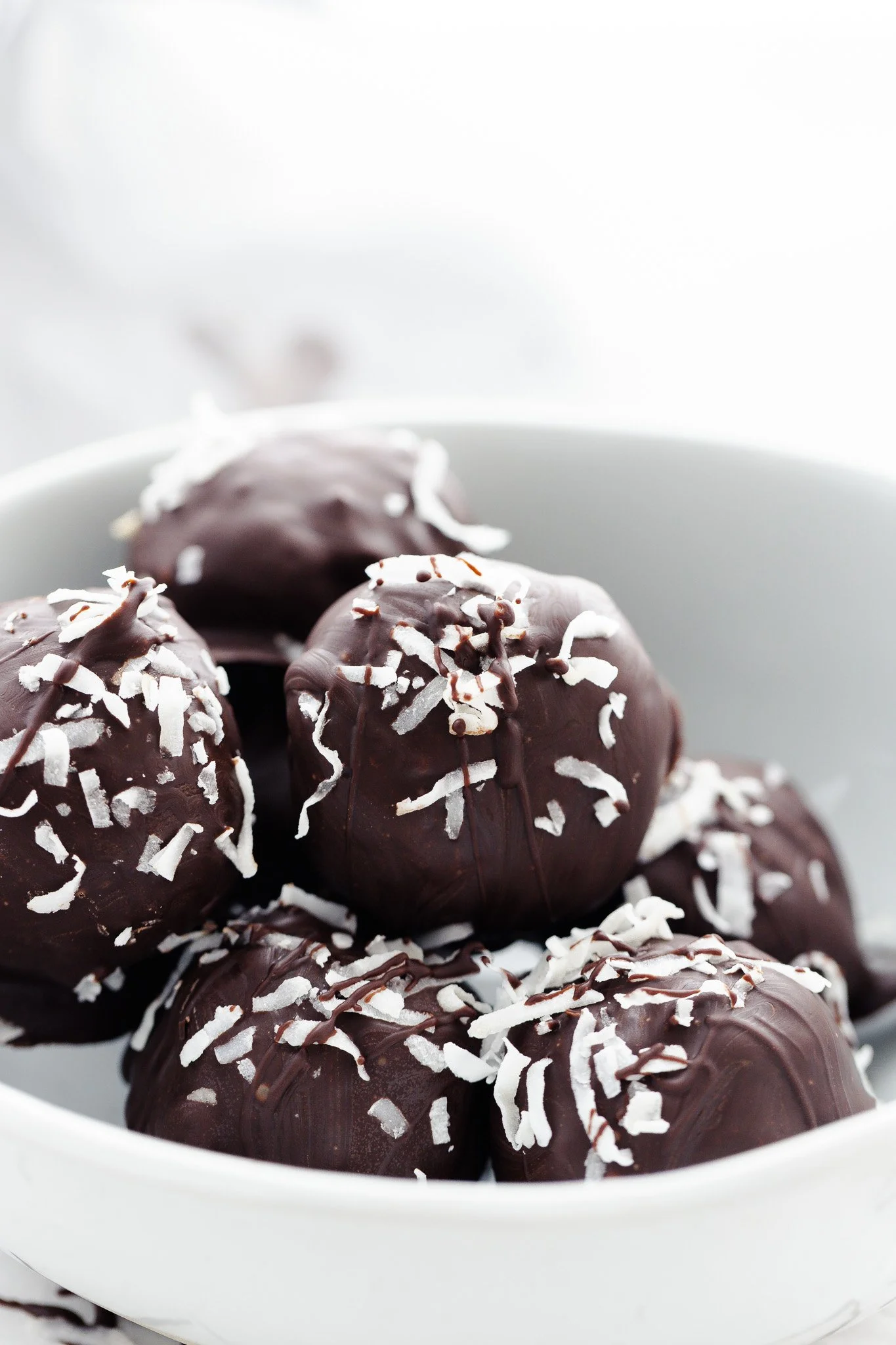 Dip each protein ball into the chocolate, top with coconut flakes, and place in the fridge or freezer to set.